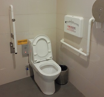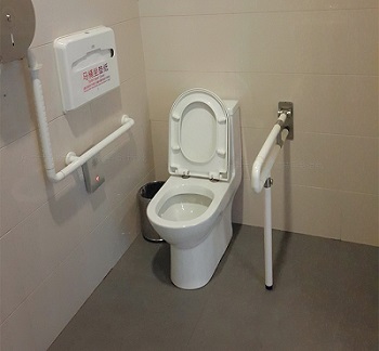 卫生间马桶靠墙一侧需安装水平和竖向辅助起身扶手(推荐扶星源L型卫生间扶手),没靠墙部分应该安装上翻带折叠扶手(推荐扶星源FT-8005卫生间上翻带支腿扶手);